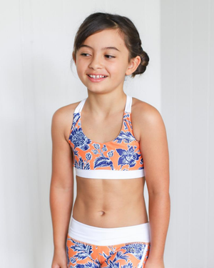 You'll pop in Chasing Oso's Desert Flower Sports Crop Top. Our kids crop features a bold desert orange floral pattern with pops of blue and fresh white trims. With multi cross-back strapping that boasts ultimate stretch for the perfect fit, whether you're in the gym, on the field or just repping your Oso for everyday wear, you're going to love the Desert Flower Crop.