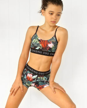 Smash the track running in our high performance Geneva Crop. Crafted from  breathable, stretchy fabric and embellished with playful leafs and a tropical floral print. Our gorgeous Oso Crop is stylish and is designed for comfort, style and agility. With signature metallic gold logo branding to the centre back, our crop is finished off with 'CHASING OSO' to the band. You won't want to miss this!
